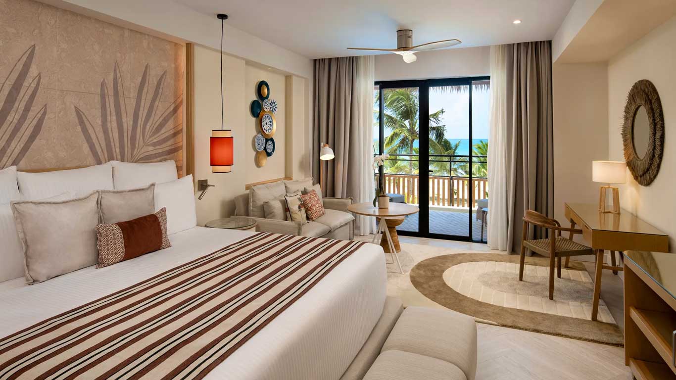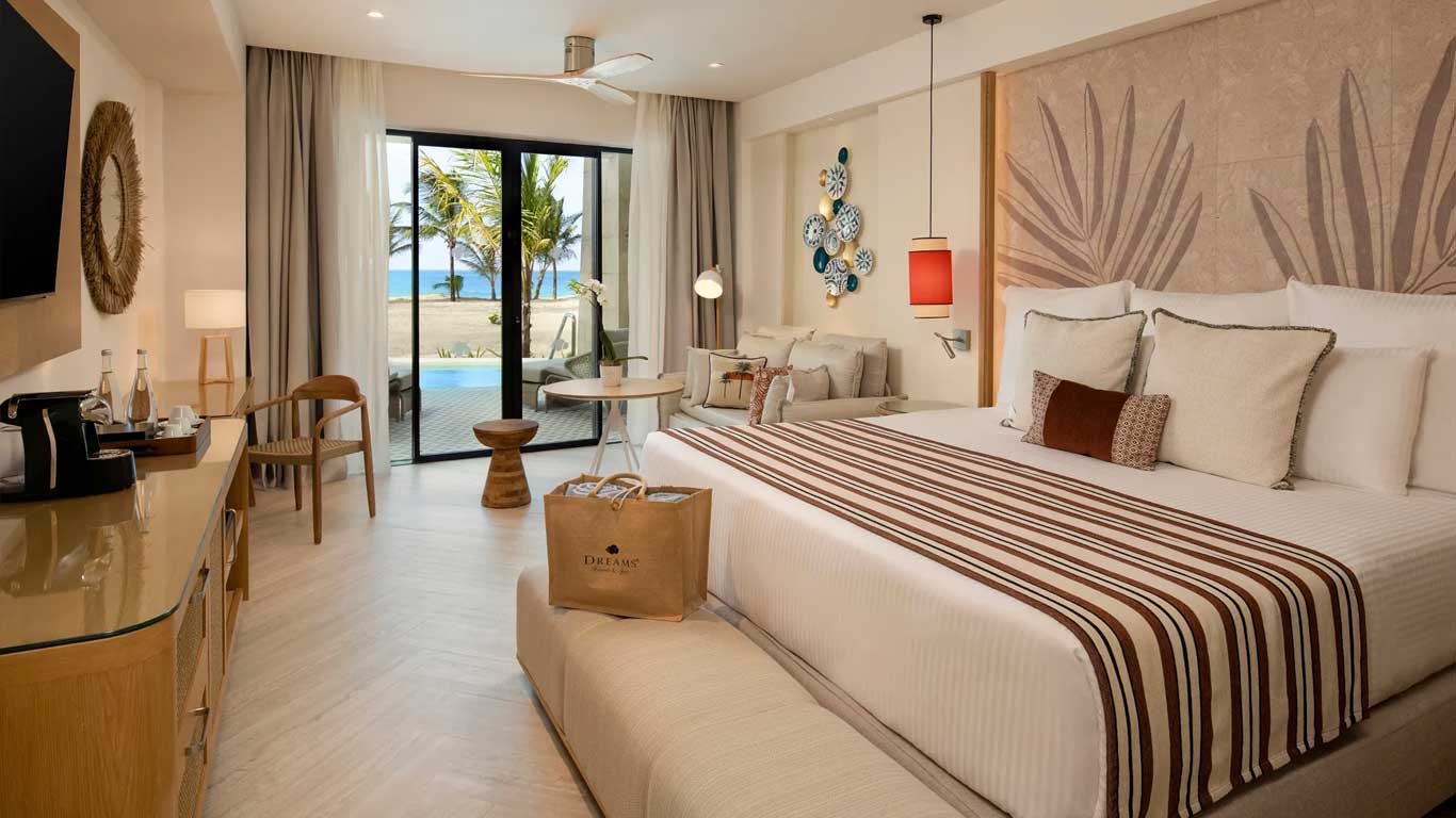 The Ocean Front Junior Suite at Dreams Cozumel Cape Resort & Spa offers your choice of one king-size bed or two queen beds, along with a private, furnished balcony or terrace and exclusive Preferred Club amenities. The king room accommodates up to three guests with a maximum of two adults, while the queen room accommodates up to four guests with a maximum of three adults. This spacious suite provides 473.6 sq. ft. of comfort and breathtaking oceanfront views.